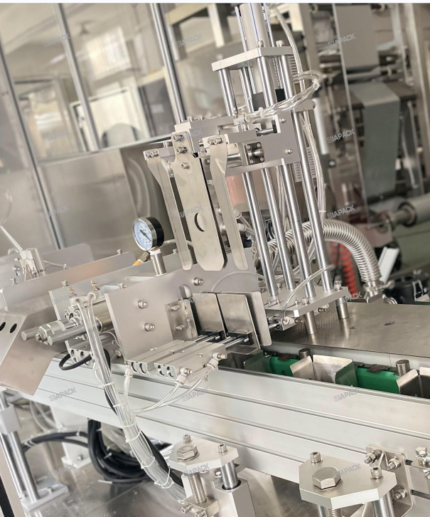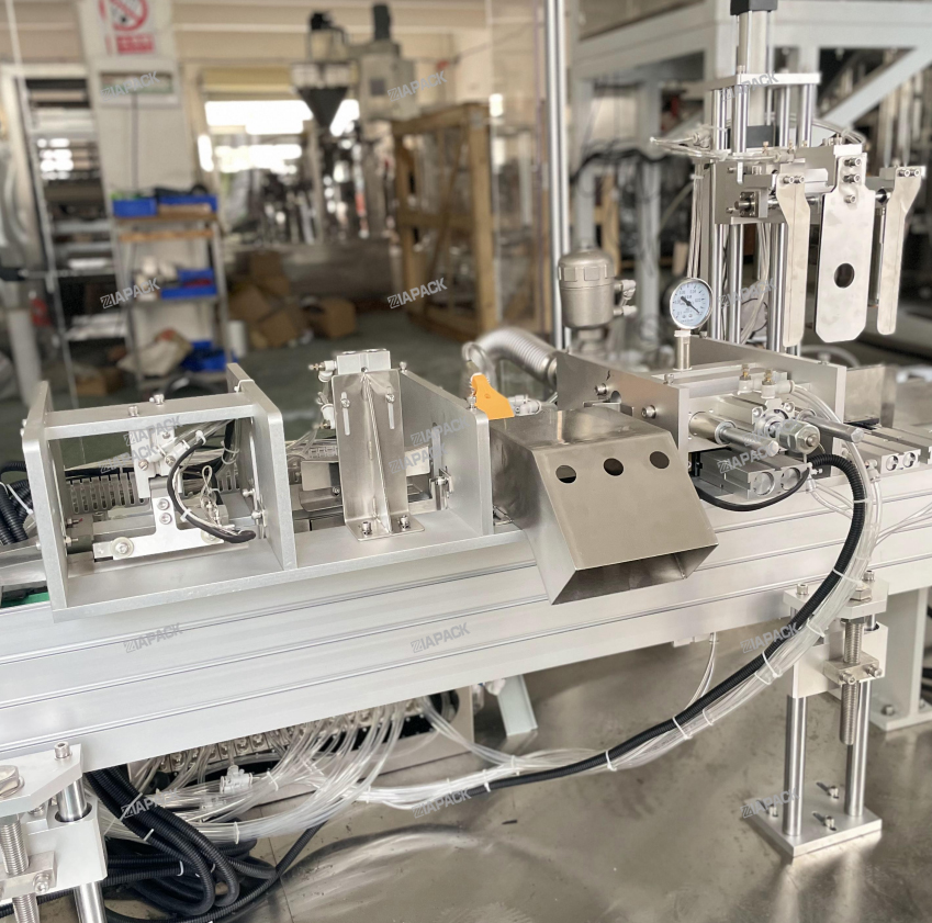 Ова машина је специјалног дизајна за прављење врећице са горњим натписом. Након пуне торбе са испуштањем производа на ову машину. Ова машина ће носити торбу, проћи кроз једнократно савијање вреће на уста, а затим залепити етикету. Оквир машине направљен од стране СУС304 .ПЛЦ и екран осетљив на додир усвајају бренд Сиеменс .А пнеуматски делови усвајају СМЦ бренд .Главне електричне компоненте усвајају бренд Омрон и Сцхнеидер.Ова машина ради са аутоматском машином за паковање како би достигла готову етикету на врху вреће .Ова машина може аутоматски доћи до функције. налепнице одвојене ,Слање налепница .Детектор етикета и пресовање етикета .