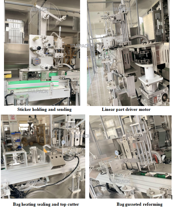 машина ће носити торбу, проћи кроз једнократно пресавијање вреће на уста и затим залепити етикету. Оквир машине направљен од СУС304. ПЛЦ и екран осетљив на додир усвојити бренд Сиеменс. А пнеуматски делови усвајају СМЦ бренд. Главне електричне компоненте усвајају бренд Омрон и Сцхнеидер .