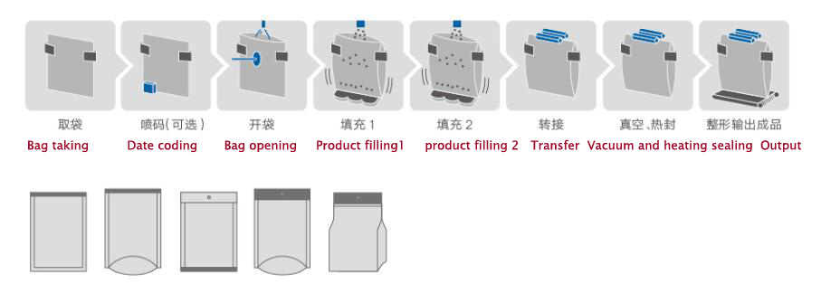 Ток рада: паковање → штампање датума производње → врећа за отварање → пуњење 1 → пуњење 2 → упражњено место → топлотно заптивање → обликовање и излаз