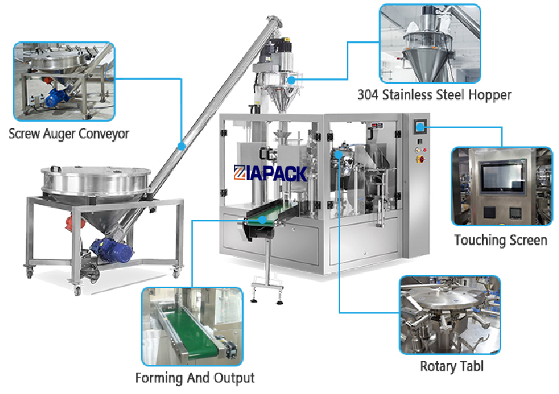 Опремљен Аугур Филлер и Сцрев Елеватор, широко је примењен на паковање прашка, као што су прах детерџента, млеко у праху, брашно, зачин, кокосов прах, млевена кафа и тако даље.