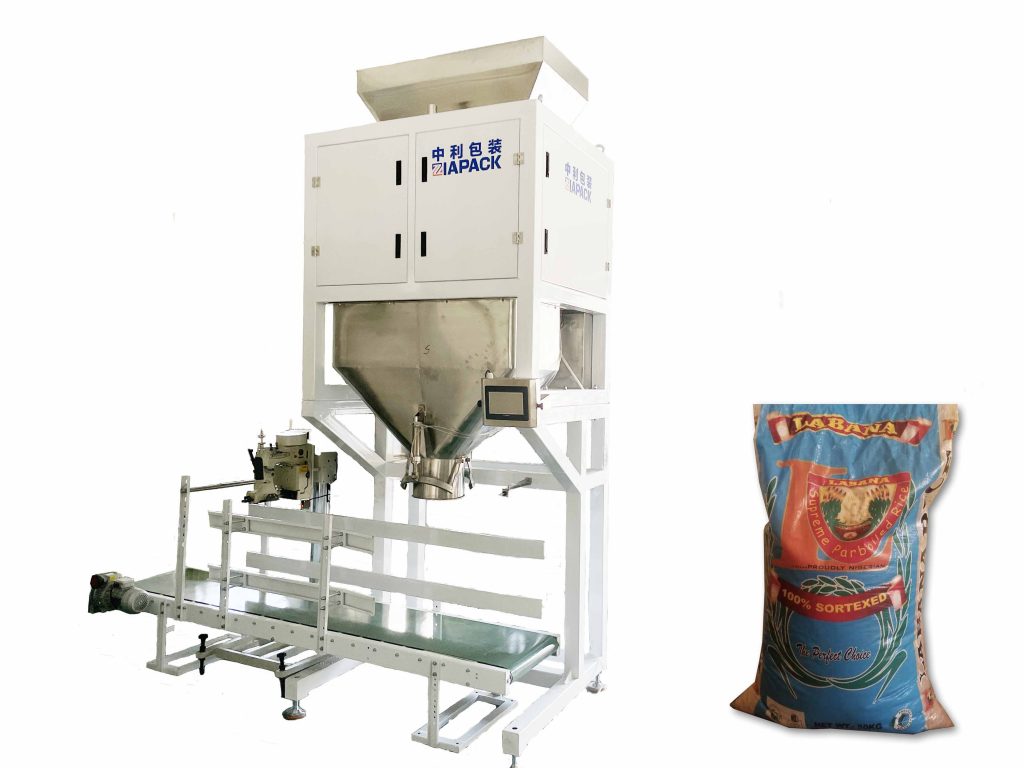 Ова машинска јединица укључује један сет ваге са двоструким кантама за мерење 30-50 кг. Један сет излазног транспортера од 3 метра, један сет машине за затварање ПЕ кеса и један сет машине за шивење кеса од јуте. Читава машина може аутоматски да врши мерење производа, пуњење производа, аутоматско шивење кеса и термичко заптивање. Потребно је само ручно убацивање кесе.