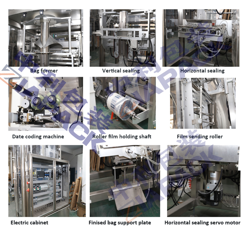 Цела машина направљена од нерђајућег челика 304, ова машина опремљена прављењем врећа, сечењем, штампањем кода итд. Сиеменс ПЛЦ и екран осетљив на додир, Панасониц серво мотор, јапански фото сензор, корејски ваздушни вентил, итд.
