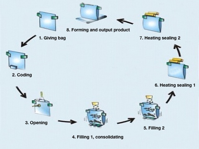 Пре-направљена торбица за пуњење и заптивање, састављена од 8 радних станица ефикасности и стабилности, наглашава пакет стојеће врећице, торбу за зиппер, врећицу за врећу и различите претходно направљене врећице. Сарадња са различитим дозирним системима (комбинација вага / линеарни вагање / вијак за вијке / клипни пуњач) и аутоматских дизалица, широко се примјењује на грануле, течност и прах.