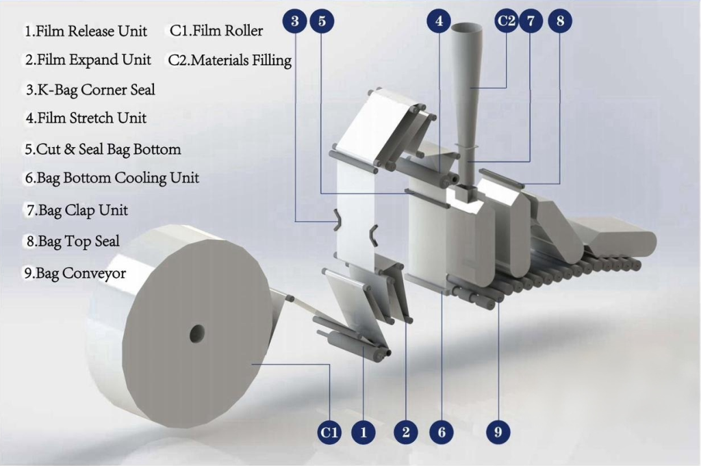 2.The standard K-type bag corner sealing mechanism makes the bag packaging finished product more square and increases the stability of the pallet after palletizing